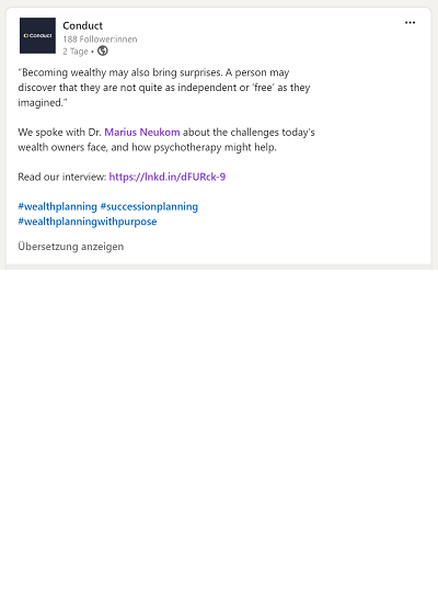 Marius Neukom in the interview with Conduct (2024): Opening the horizon: how psychotherapy can encourage a deeper understanding of the complexities of wealth.